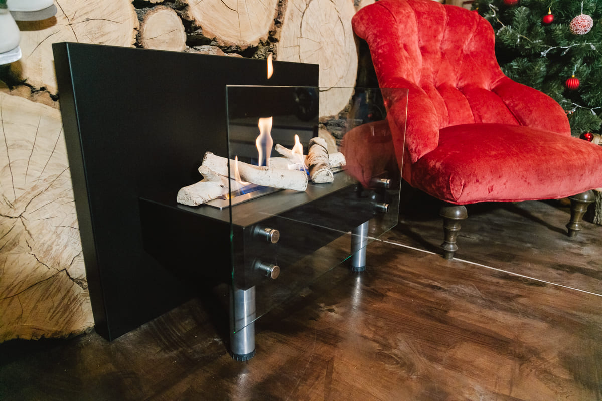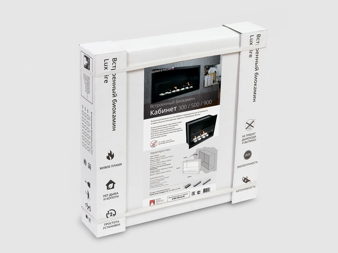 Представляет собой сборный металлический каркас с топливным блоком Lux Fire 300 М, закрепленный на 4 дистанционных держателях к защитному стеклу с упором на мебельные ножки.