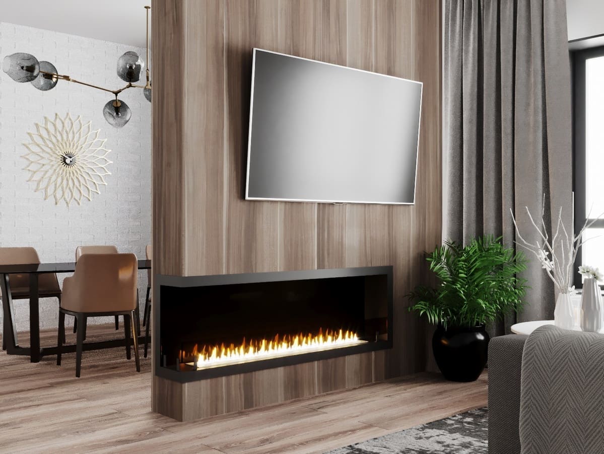 Левый угловой биокамин «Честер 1500» изготовлен из стали и нержавеющей стали, окрашен термостойкой порошковой краской.