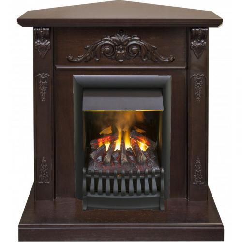 Портал каминокомплекта является образцом яркой классики. Важным преимуществом такой модели является то, что он не выглядит громоздко даже с учетом используемых декоративных элементов. Боковые стенки, обрамляющие очаг, оформлены резьбой, имитирующей пилястры. В верхней же части сформированы аккуратные резные консоли, которые визуально поддерживают угловую каминную крышку. Верхняя панель, расположенная над очагом, украшена богатым декоративным узором. Но выглядит он вполне уместным в общем дизайне конструкции. Крышка камина отличается легкостью и отсутствием массивности. Установлен портал на невысокое основание, которое обеспечивает законченный вид конструкции и придает ей более высокую устойчивость.
