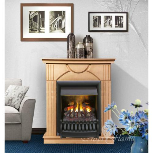 Портал представленного каминокомплекта выполнен с использованием современного материала МДФ, который характеризуется схожими с натуральной древесиной характеристиками, но при этом практически лишен основных ее недостатков. В частности это касается устойчивости к перепадам температуры и влажности. Хоть МДФ и имеет волокнистую структуру, изменения параметров микроклимата на материале отражается незначительно. Дополнительную защиту обеспечивает слой натурального шпона, который по своей текстуре и цвету имитирует поверхность древесины светлого дуба. Это покрытие также выполняет и декоративную функцию.