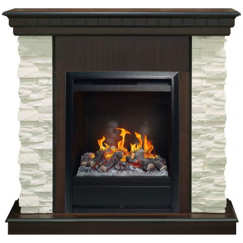Каминокомплект «Elford» от производителя Real Flame оборудован современным паровым очагом «3D Olympic», пламя в котором отличается максимально высокой реалистичностью. В оформлении портала использовано сочетание искусственного камня белого цвета и МДФ, имитирующего расцветку античного дуба. Такой контраст расцветок выглядит современно и придает изделию более основательный вид. При этом габариты изделия небольшие, что дает возможность использовать камин для оформления малых по площади помещений. Камень используется в облицовке боковин портала. Зона очага оформлена вставкой из МДФ, которая переходит в массивную каминную крышку. Для декора она украшена легким фризом по периметру. Установлена вся конструкция на небольшое основание, приподнимающее очаг над уровнем пола.