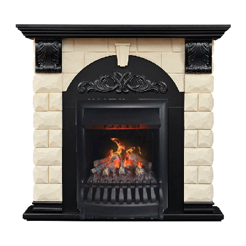 По своему стилю камин напоминает очаги, которые когда-то устанавливались в каминных залах старинных особняков. Но четко выдержанные пропорции и сочетание цветов делает его уместным и в современных квартирах. Фронтальная часть боковых стенок украшена только резными изогнутыми консолями, на которые нанесен растительный орнамент. На них опирается каминная крышка со ступенчатой кромкой. Зона очага оформлена арочной вставкой с растительным орнаментом и каменным клином в своде. Устанавливается вся конструкция на небольшое основание.