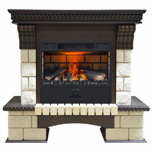 Портал каминокомплекта по своей форме напоминает старинные очаги. В нем четко выделены зона очага и основание. Очаг обрамлен каменными стенками, в верхней части которых расположены изогнутые консоли. Они используются для визуальной поддержки массивной каминной крышки. Основание портала выполнено в форме арки, свод которой оформлен вставкой из МДФ. Непосредственно перед очагом основание оформлено имитацией шамотного кирпича, а по бокам – полочками из МДФ. В арку основания ля большей реалистичности можно уложить настоящие Муляж дров. В моделях de Luxe кромка полочек и каминной крышки оформлены резным канатом.