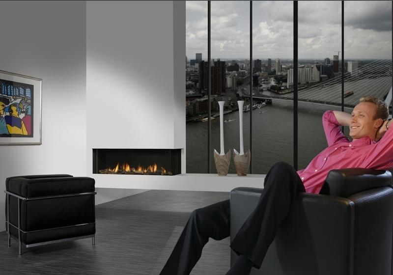 Представлен широкий угловой встраиваемый газовый камин Faber Duet XL с закрытой топкой. Можно выбрать левый или правый угол. Оформление топки декоративным комплектом дров и хвороста или белой галькой. Необходимо подключение к коаксиальному (труба в трубе) дымоходу.