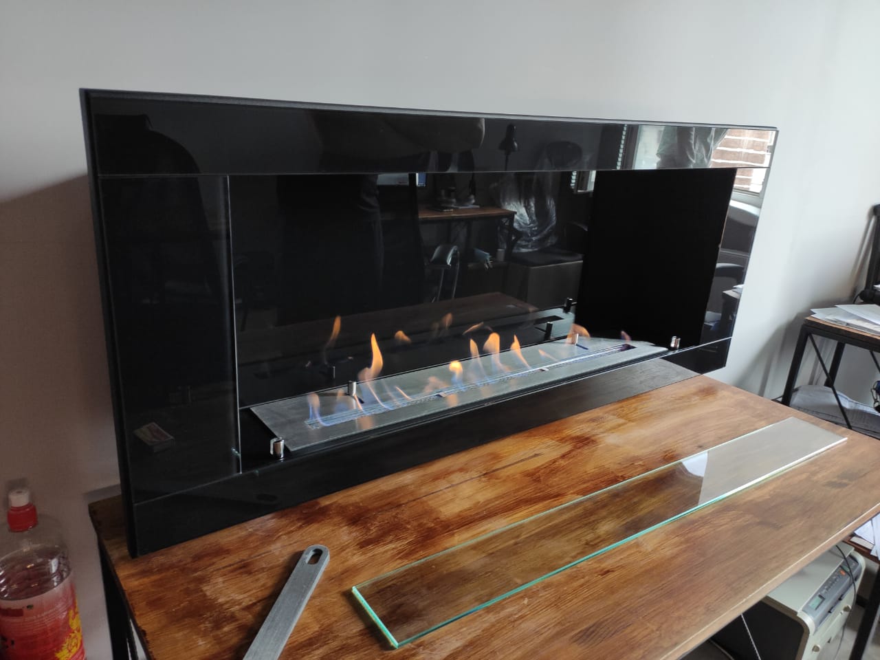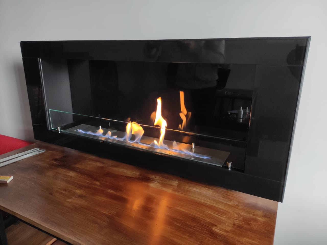 По проекту дизайнера был спроектирован и изготовлен встраиваемый биокамин с топливным блоком 700 мм. Корпус камина окрашен черной термостойкой краской муар. На внешней рамке и внутренней поверхности камина наклеено черное стекло - стемалит. Установлено защитное термостойкое стекло серый графит.